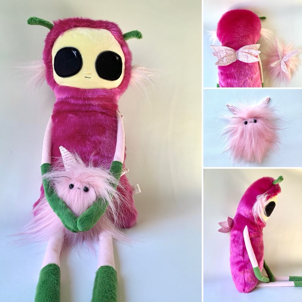 Fairy Fluff is made from faux fur and cotton. Plastic safety eyes. Thread antennae.